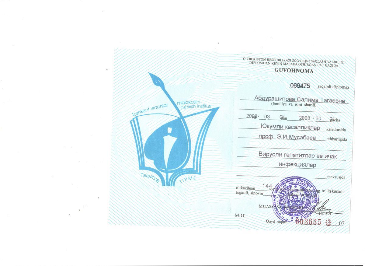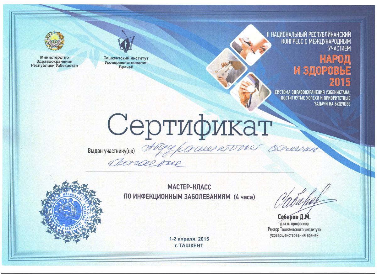 - 2015 г. – сертификат «Хронические Вирусные гепатиты В, С, D»;