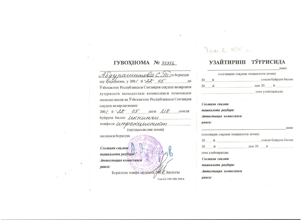 - 1994-2000 гг. – Ташкентская городская инфекционная больница, врач-инфекционист;