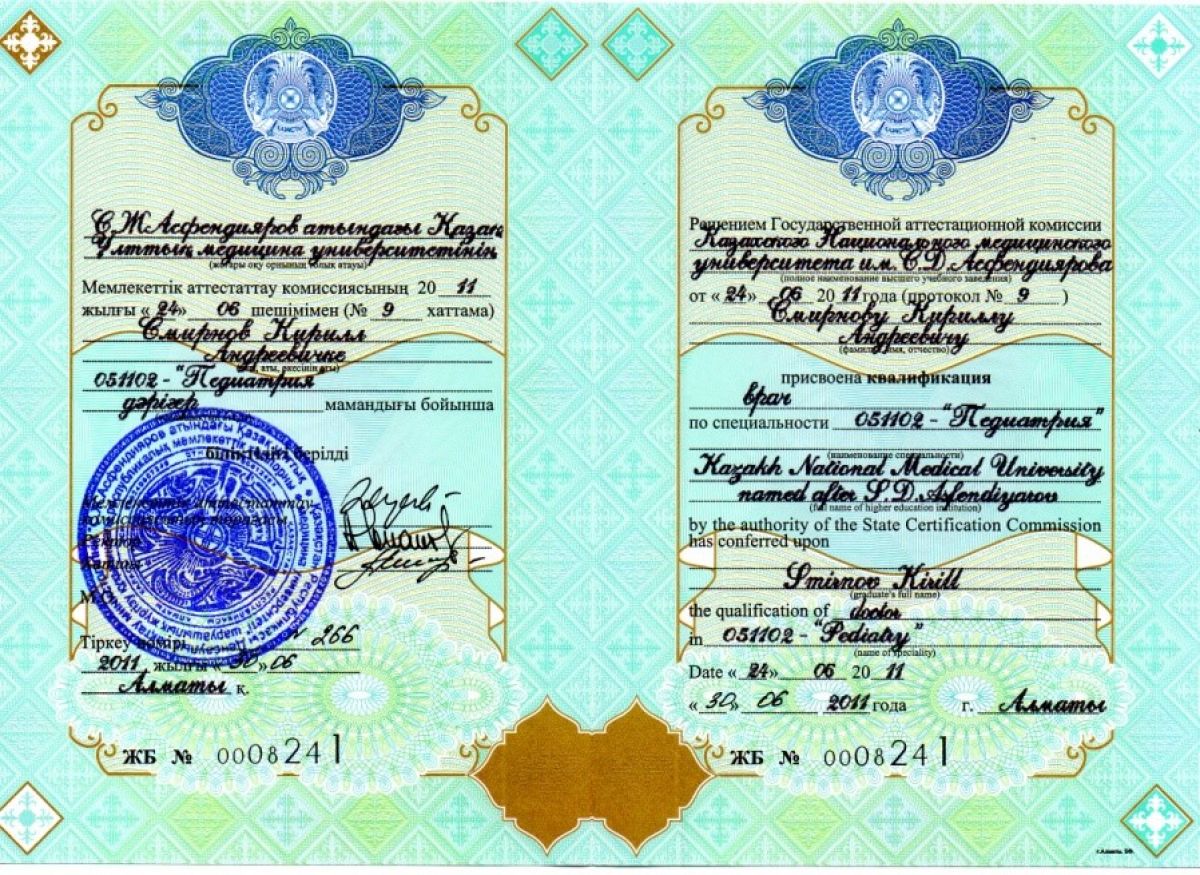 2011г. Казахский Национальный Медицинский Университет имени С.Д.Асфендиярова. Специальность: «Педиатрия»