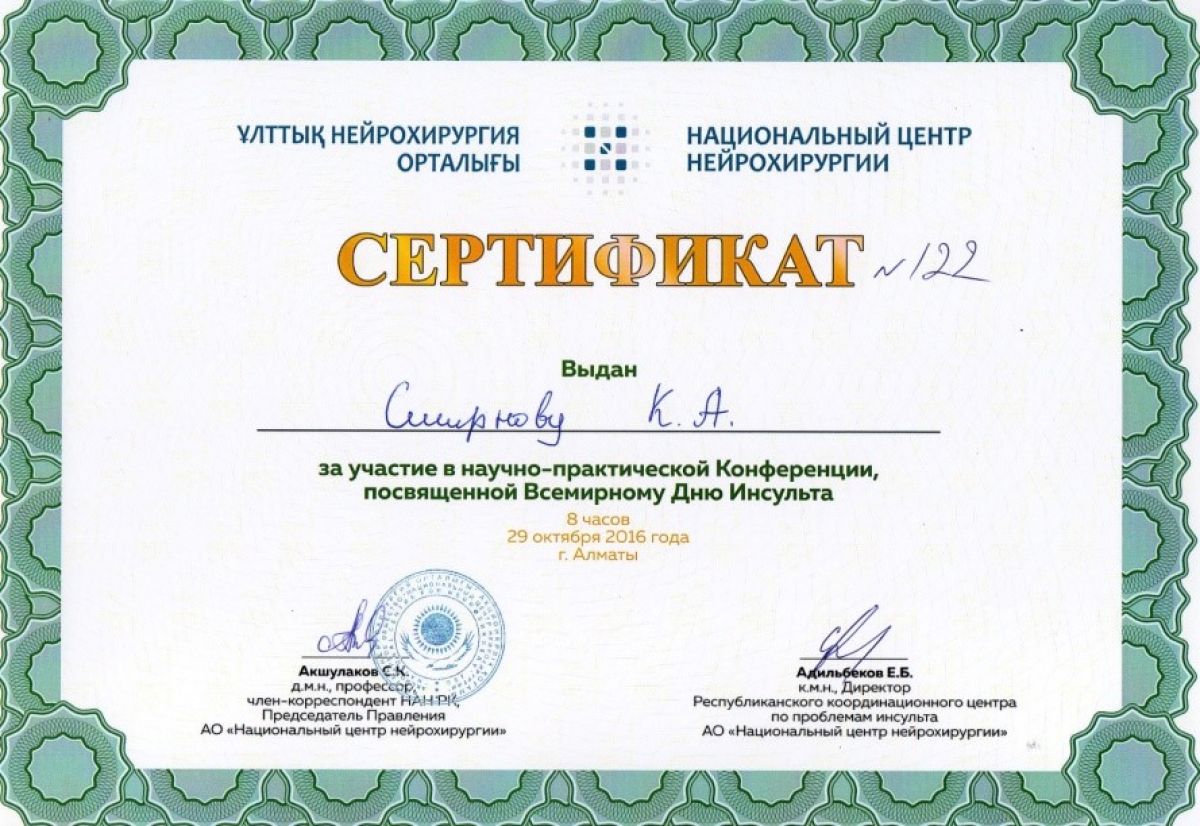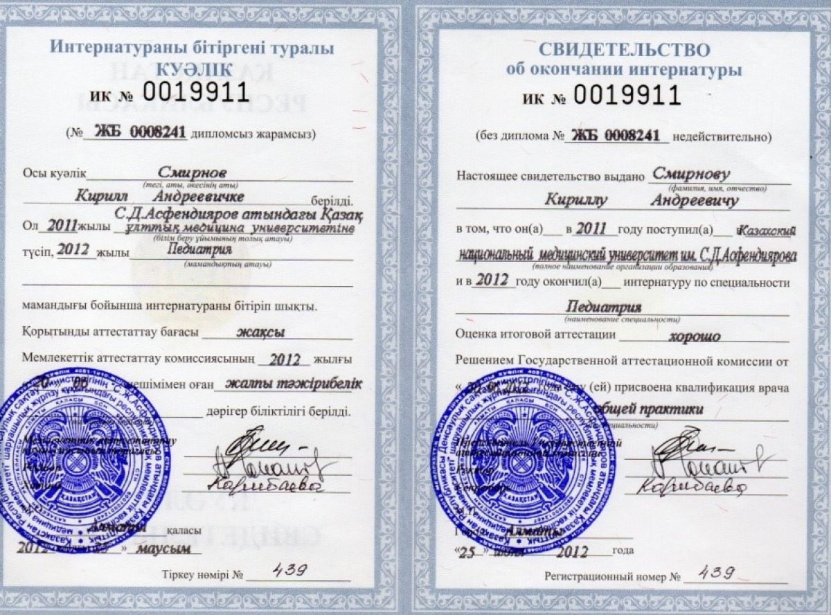 2012г. КазНМУ им.Асфендиярова, Интернатура по специальности: «Врач общей практики»