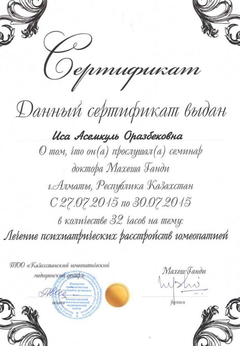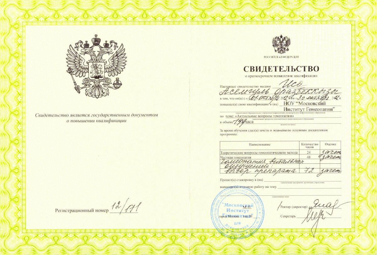 • 1996 г. – повышение квалификации «Врач-гомеопат».