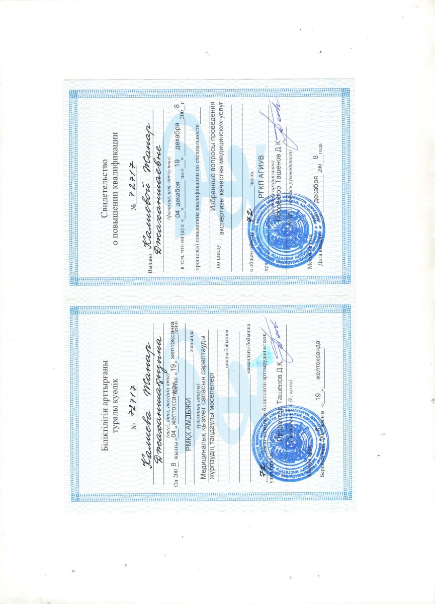 2015г. Казахском медицинском институте непрерывного образования по циклу « Преподаватель медицинских организации и науки».