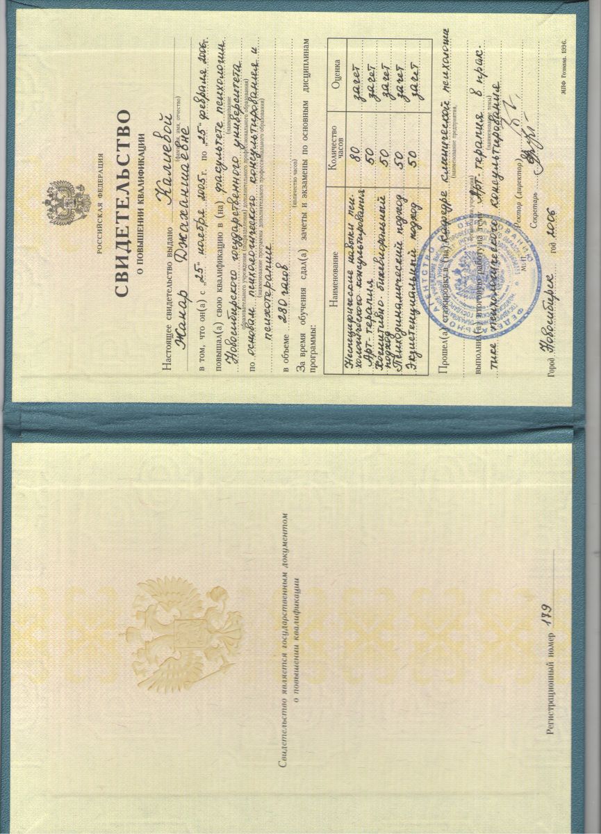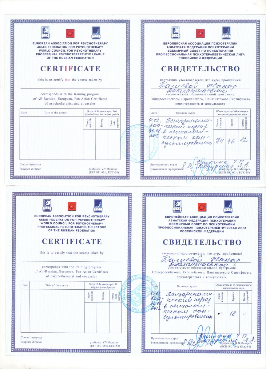 2010-2012гг. «Психодинамический подход в психологическом консультировании» г Новосибирск, сертифицированный психодинамический психотерапевт