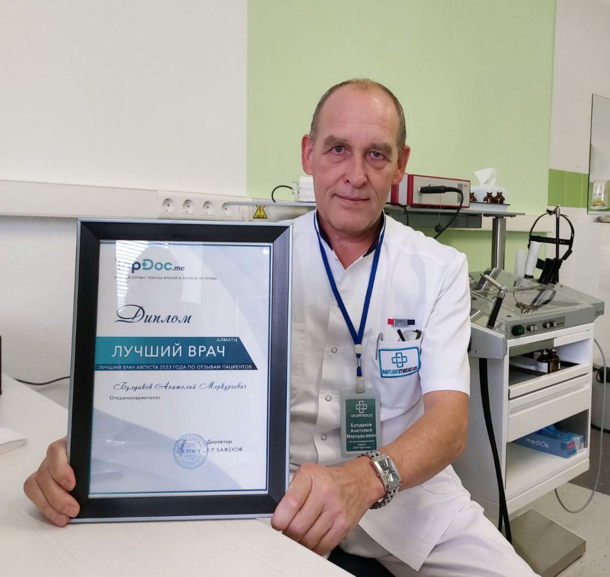 2023 жылғы тамыз айында доктор Булдаков біздің қызметіміз пайдаланушыларының пікірлері бойынша айдың үздік дәрігері атанды. ЛОР мүшелерінің ең кең тараған аурулары туралы дәрігердің сұхбатын оқыңыз: "Аденоидтар, гайморит, ангина, нафтизинге тәуелділік — барлығы кәсіби тұрғыда.