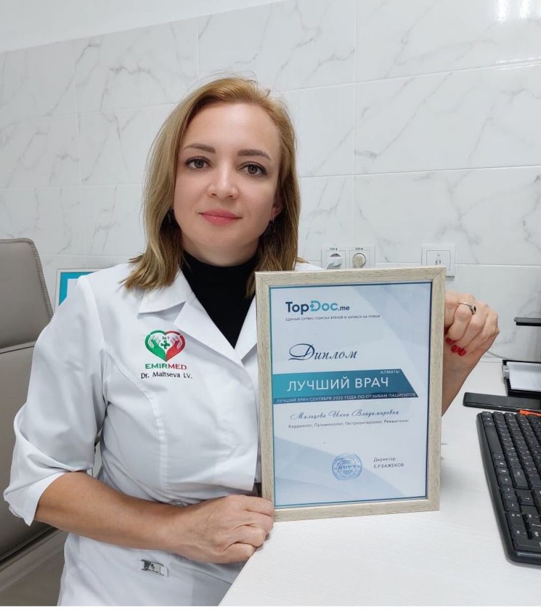 2022 жылдың қыркүйек айында Инна Владимировна біздің сайтымыз нұсқасы бойынша Айдың үздік дәрігері атағына ие болды. Миокард инфарктасы тақырыбындағы дәрігердің сұхбатын оқыңыз: Дәрігер Мальцева И.В.: "Кеуде қуысының кез келген ауырсынуы дәрігерге жүгінуді талап етеді".