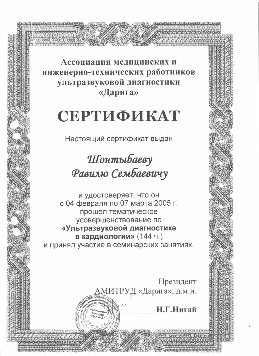 - 2016 ж. – «Клиникалық эхокардиография және халықаралық стандарттарға сай ультрадыбыстық допплерография»;