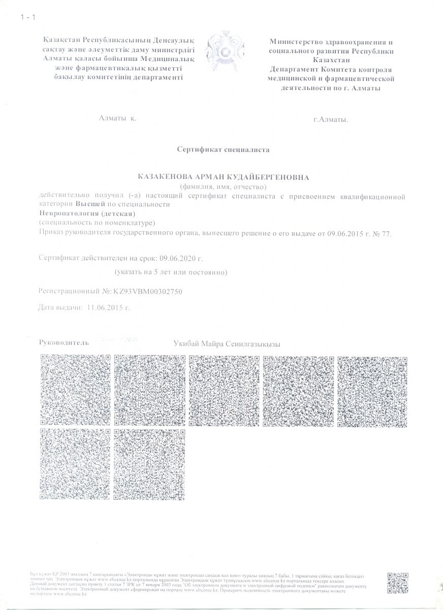 - 1997 жыл – алғашқы мамандану «Балалар неврологиясы» (жалпы жетілдіру);