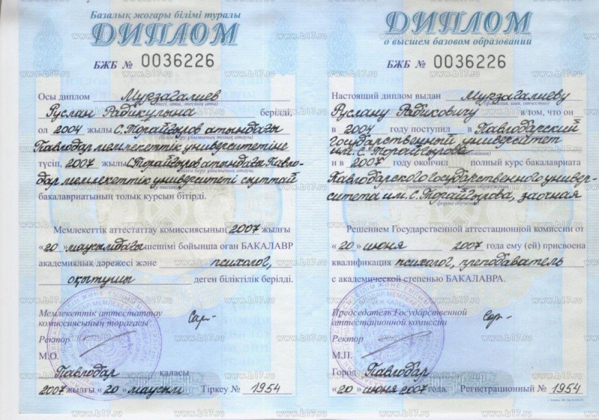 - С. Торайғыров атындағы Павлодар мемлекеттік университеті, «Психология» факультеті, «Тәжірибелік психолог» біліктілігі;