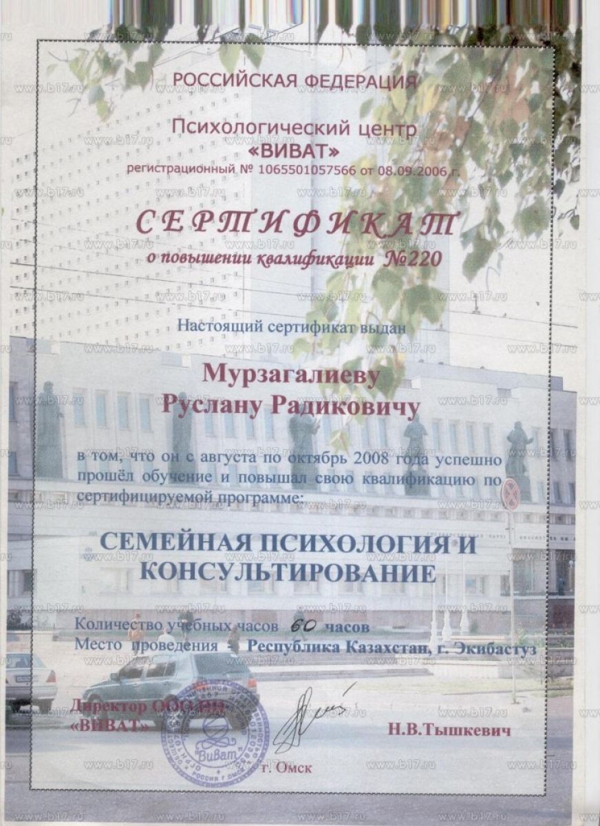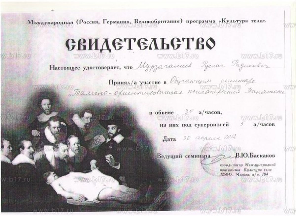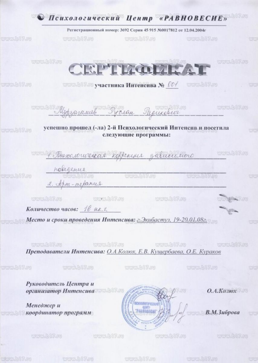 - Алматы мемлекеттік дәрігерлерді жетілдіру институты (АГИУВ), «Сот-психологиялық-психиатриялық сараптаманың құқықтық негіздерімен медициналық психология»;
